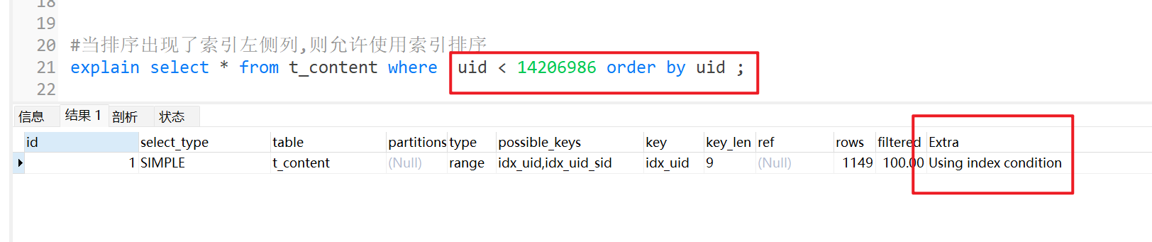 上面的查询中,用到了复合索引(多个字段组合形成一个索引),复合索引的字段顺序很重要,在上面的例子中,uid是第复合索引中的第一个字段(左侧列),在查询语句中,uid被放在了查询条件里面,此时索引生效。