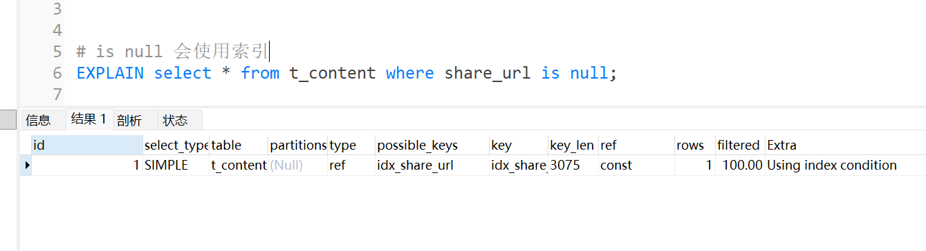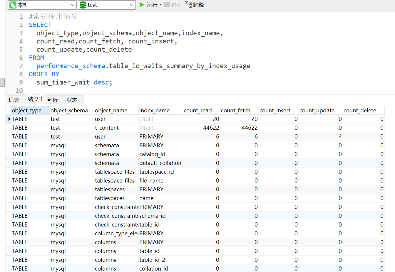 上面的SQL可以快速查询出数据库用到的索引情况,查询结果如下: