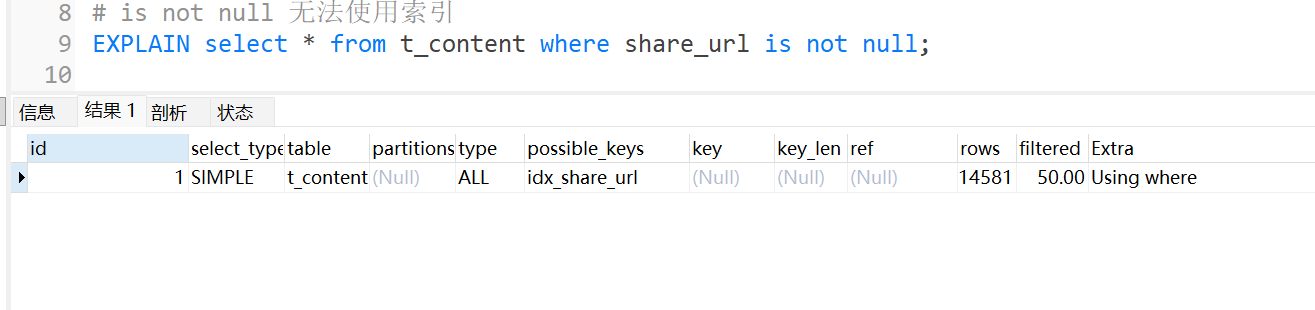 当index_name为null时,说明之前执行的SQL中,有SQL没有使用到索引,进行了全表扫描。也就是说对于index_name为null的记录越少,说明性能越好,因为用到了索引。