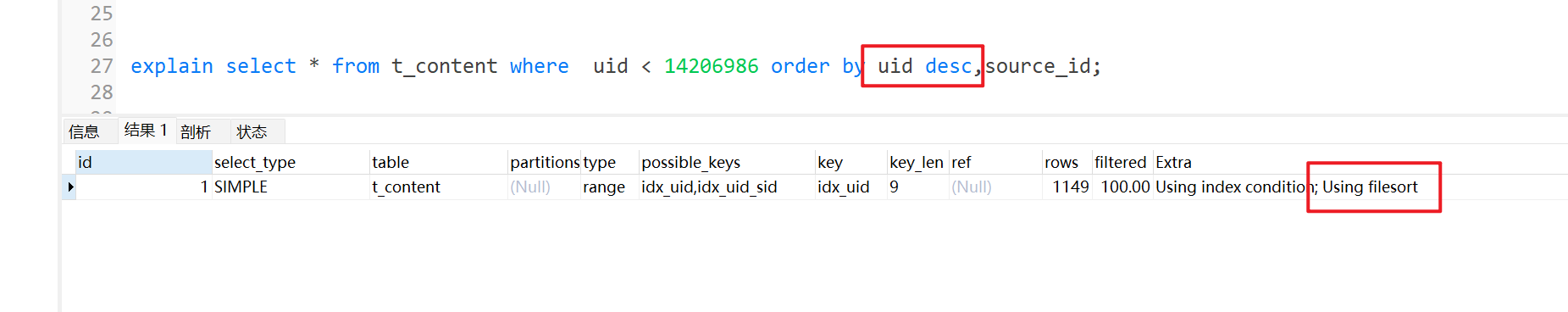 在上面的语句中,uid和source_id字段组成了复合索引,uid是索引的左侧字段,当使用order by进行排序时,如果uid(索引左侧列)为desc(降序),不会使用索引,排序就是Using filesort方式,比较慢的排序方式。