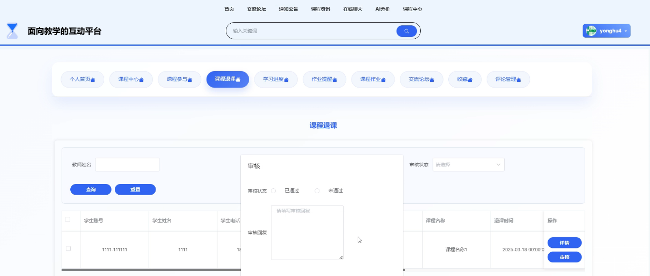- 课程退课管理:为管理员提供了处理学生退课请求的工具,包括删除和查询退课记录,以及审核退课请求。这有助于维护课程的完整性和学生的满意度。
