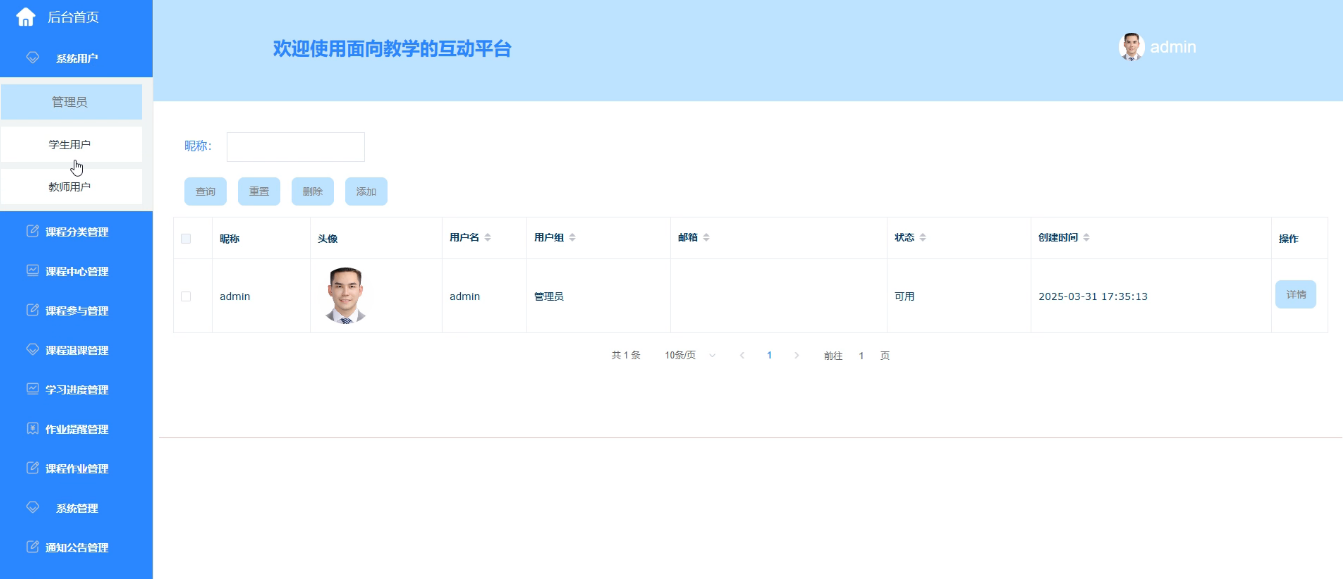 - 系统用户:允许管理员对平台上的用户进行分类管理,包括管理员、学生用户和教师用户。管理员可以添加新用户、删除或禁用现有用户,以及编辑用户信息。这确保了平台用户信息的准确性和安全性。