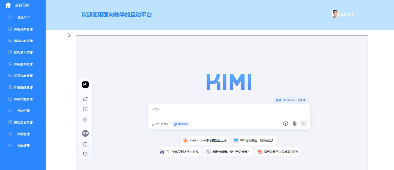 - 后台首页:管理员登录后的第一个界面,后台首页提供了快速入口,方便管理员访问个人信息、修改密码以及使用智能AI助手kimi。