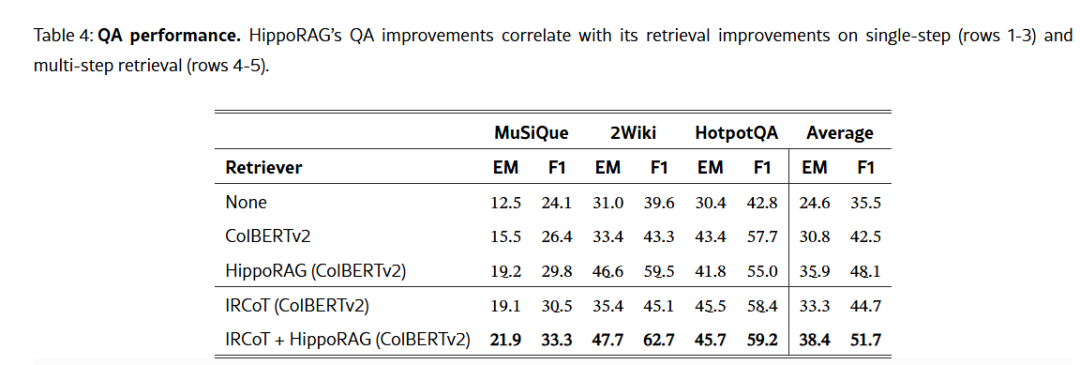 HippoRAG的问答改进与其检索改进高度相关。在单步检索和多步检索设置下,系统都展现出了显著的性能提升 。