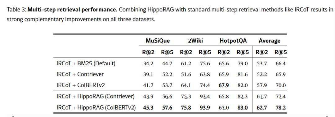 更令人振奋的是,HippoRAG与标准多步检索方法IRCoT结合使用时展现出强大的互补性:
