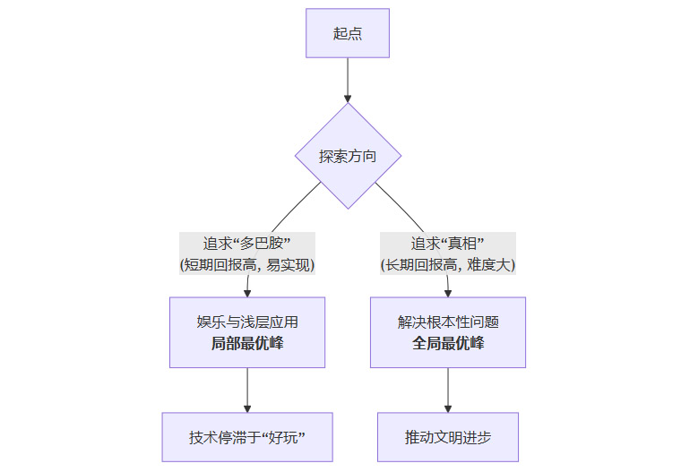 这个“局部最优峰”就是由各种娱乐性、浅层AI应用构成的繁荣景象。它看起来很高,回报很快,吸引了绝大多数的资源。然而,旁边可能存在一个更高、更有价值的“全局最优峰”——即利用AI解决人类面临的重大挑战。如果所有人才和资本都涌向了那个更低的“山峰”,我们可能永远没有足够的力量去攀登那座真正的高峰。