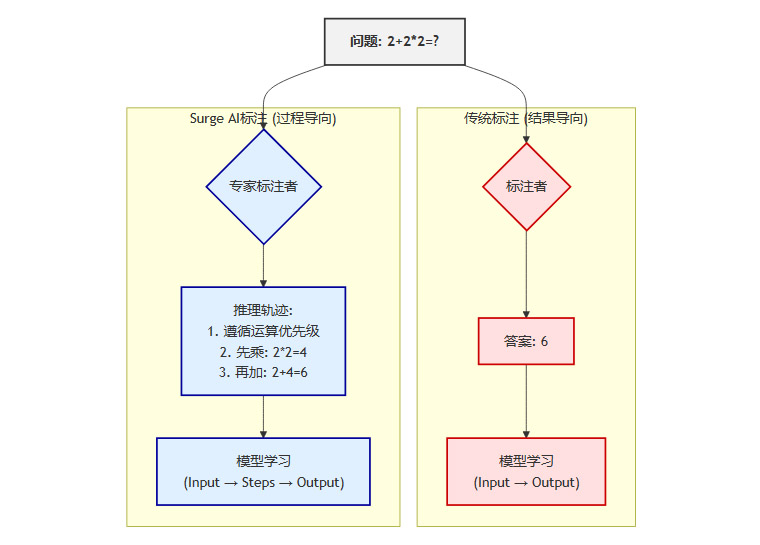 这是Surge AI最具洞察力的一点。他们不仅仅要求标注者给出最终的“正确答案”,更要求他们详细记录得出这个答案的完整思考过程,即“推理轨迹”(Chain of Thought)。