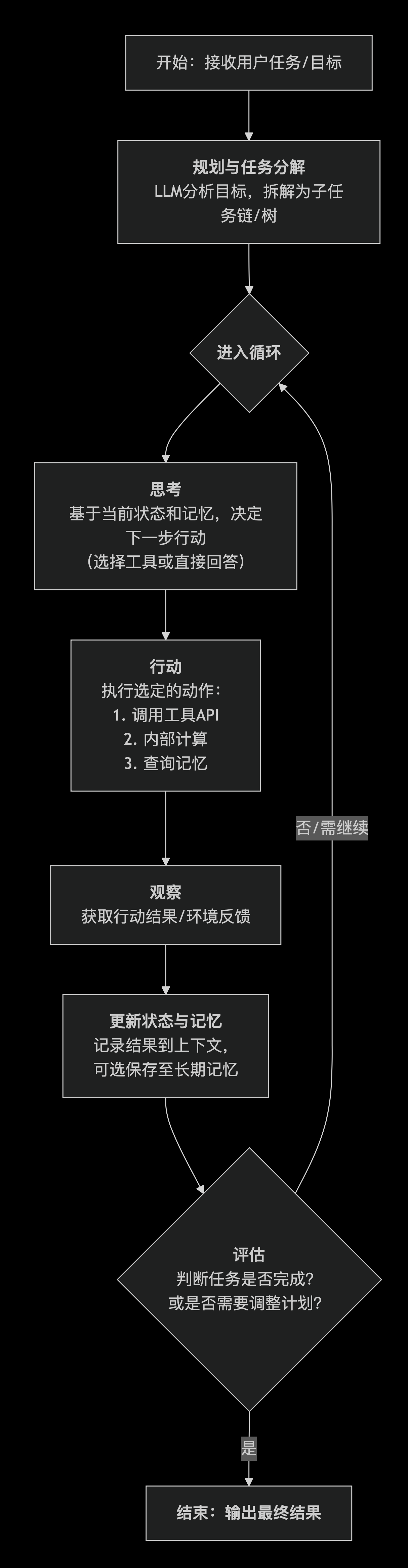 - 更新:将本次“行动-观察”的结果添加到工作记忆中,为下一步决策提供上下文。重要的信息可能被存入长期记忆。