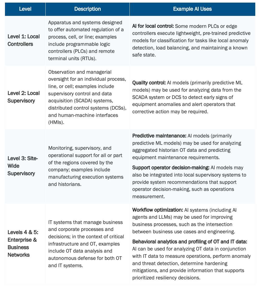 基于普渡模型的AI应用:普渡模型仍是理解运营技术(OT)与信息技术(IT)设备及网络层级关系的广泛认可框架。表1展示了基于该模型在关键基础设施中已建立及潜在的人工智能应用示例。机器学习技术(如预测模型)通常应用于运营层(0-3层),而大型语言模型则主要应用于业务层(4-5层),其数据可能来源于运营技术网络的导出数据。