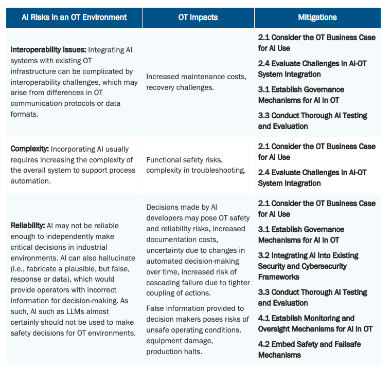 下文将探讨人工智能集成风险及其对运营技术运行的潜在影响。表2概述了关键基础设施所有者和运营商应考虑的已知AI风险(注:此列表不完整;关键基础设施所有者和运营商应调查其组织特有的风险)。本指南后续章节将讨论这些风险的缓解措施;请参阅表2中“缓解措施”列的交叉引用。
