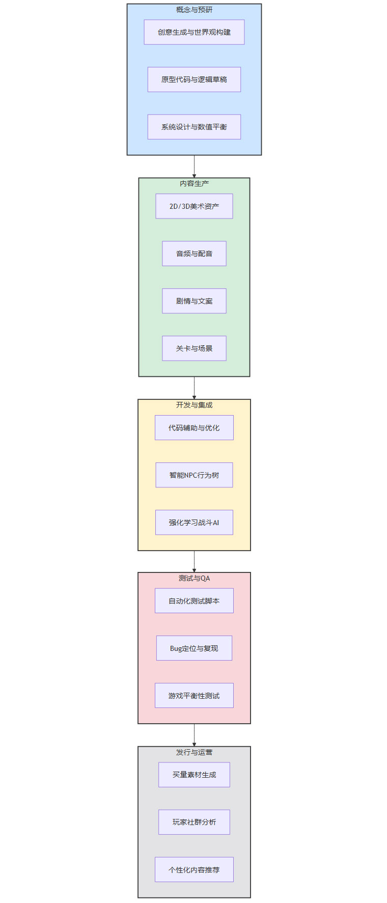 下图展示了AI在现代游戏开发管线中的主要集成点。