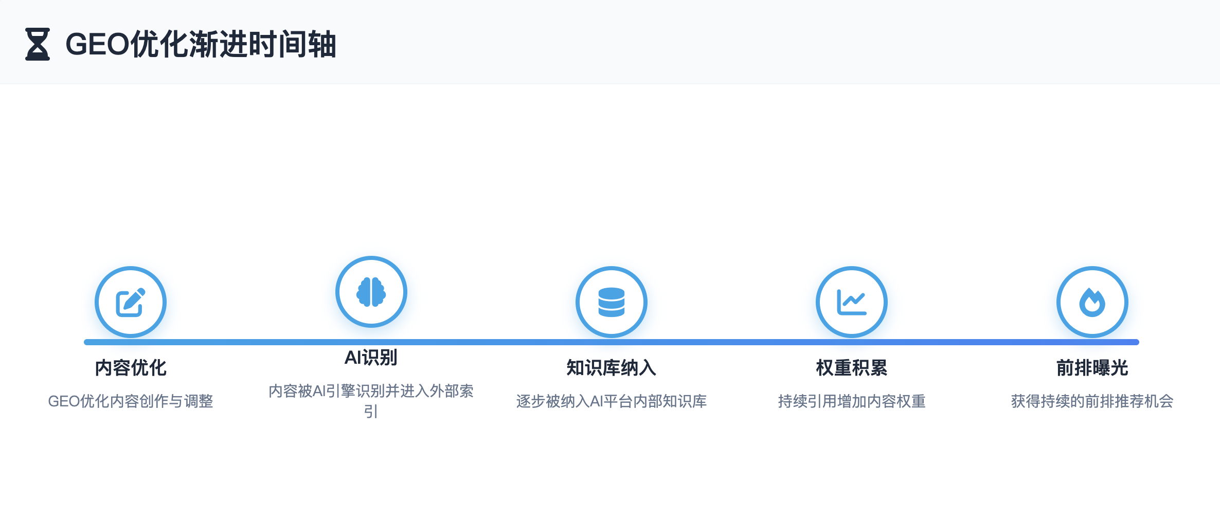 AI平台的学习周期使得GEO优化的效果变得更加渐进。内容首先被AI引擎识别,并进入外部索引。随着品牌内容的持续引用,它将逐步被纳入平台的内部知识库,逐渐增加其权重和曝光机会。这一过程的推进需要时间,并非所有内容都能立即实现推荐。