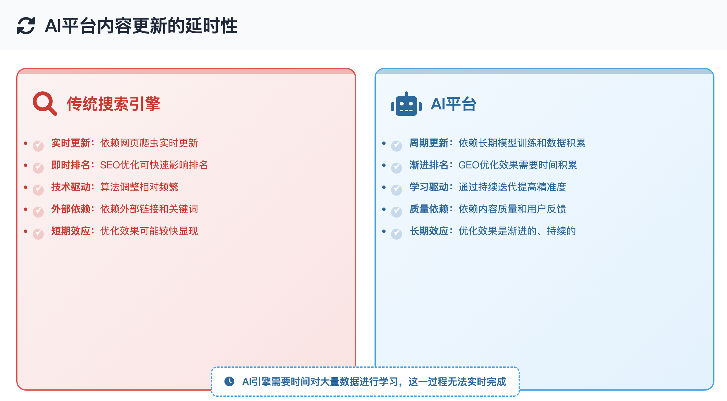 AI平台的内容更新和推荐机制与传统的搜索引擎有所不同。传统的搜索引擎依赖实时的网页爬虫更新和排名调整,而AI平台(如ChatGPT)则更依赖长期的模型训练和数据积累。这些内容更新和优化并非实时进行,因此GEO优化后的内容能否立即获得前排曝光,取决于AI平台的更新周期。