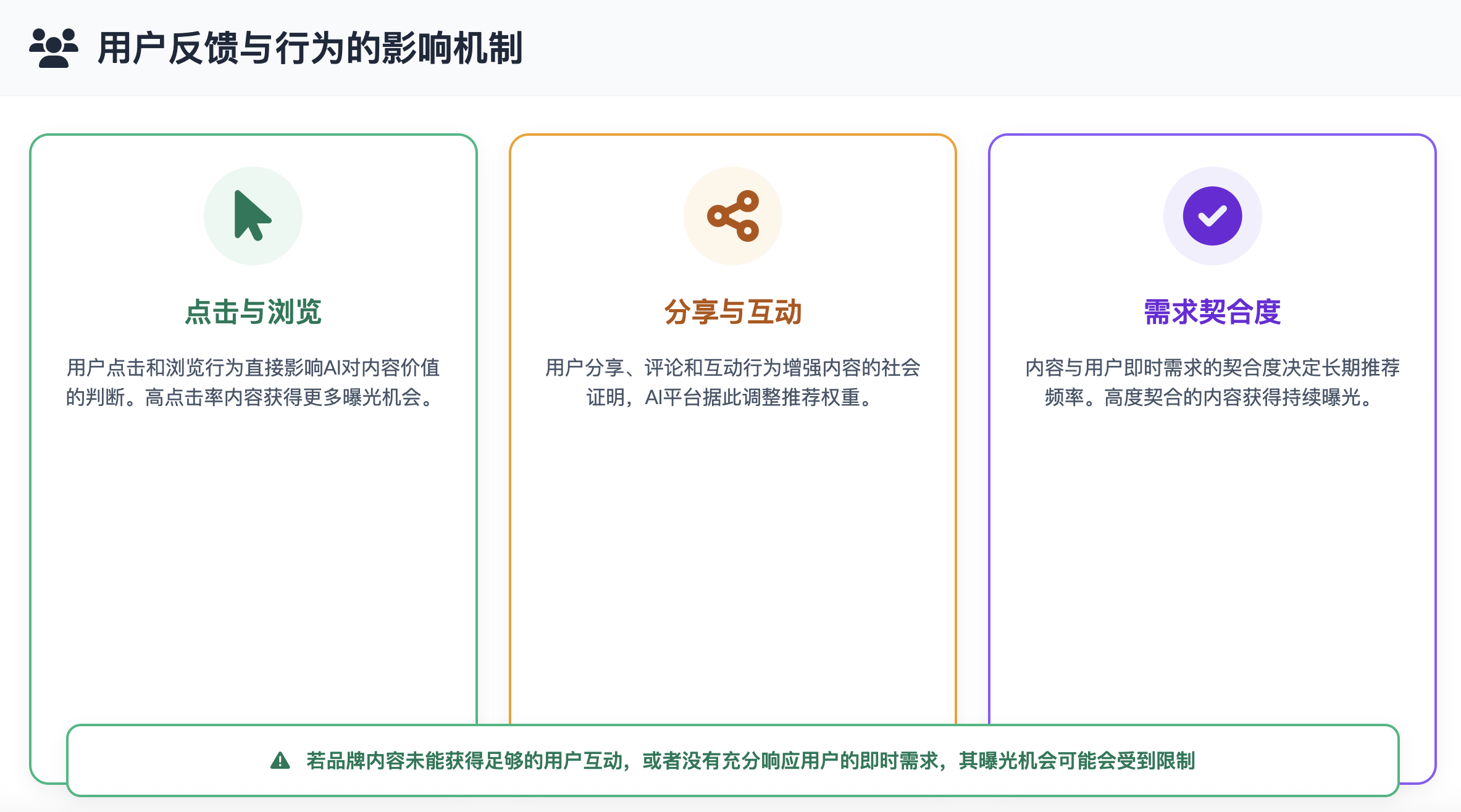 然而,若品牌内容未能获得足够的用户互动,或者没有充分响应用户的即时需求,其曝光机会可能会受到限制。因此,用户的参与度在这一过程中起到了至关重要的作用,品牌需要通过高质量内容和精准的需求对接,确保在AI平台中获得更多曝光。