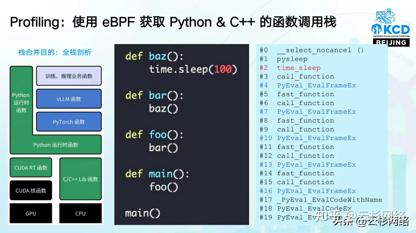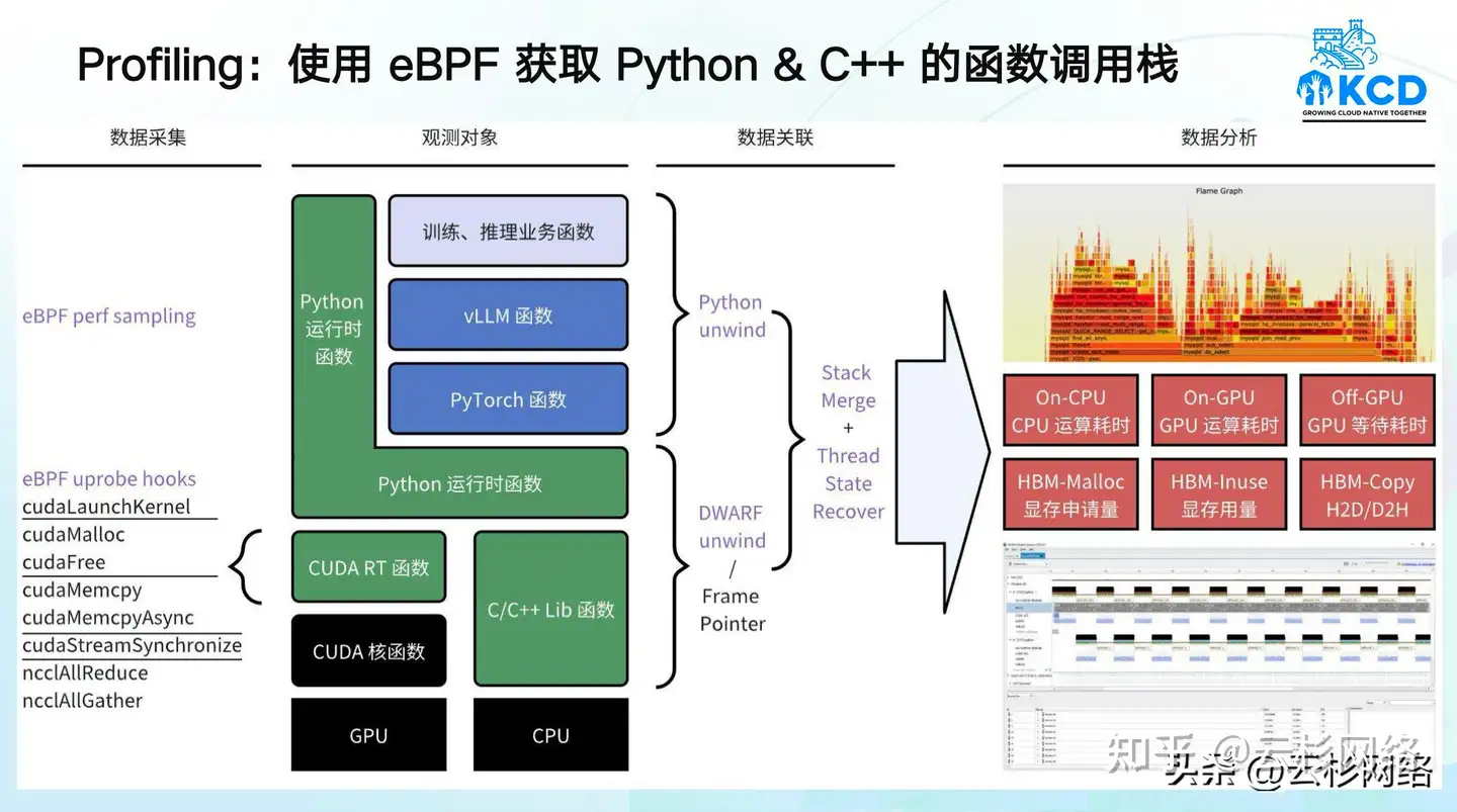 右侧是我补充的一点:eBPF不仅是Linux内核的技术,其在用户态同样具备强大的uprobe能力。尽管常有人说uprobe的开销会比内核态的kprobe更大,但这里有一个关键点:在计算密集型场景中,许多关键操作(如GPU内核函数调用,或基于InfiniBand等高速网络的通信调用)本身开销就已非常大。因其自身开销巨大,在其上附加uprobe所带来的额外资源消耗或时间代价往往微不足道。根据我们的实际测算,额外损耗仅在个位数百分比(例如1%到5%)之间。因此,在右侧所示的这类计算场景中,uprobe是完全可用的,其开销有时甚至低于许多传统插桩方式引入的性能损耗。