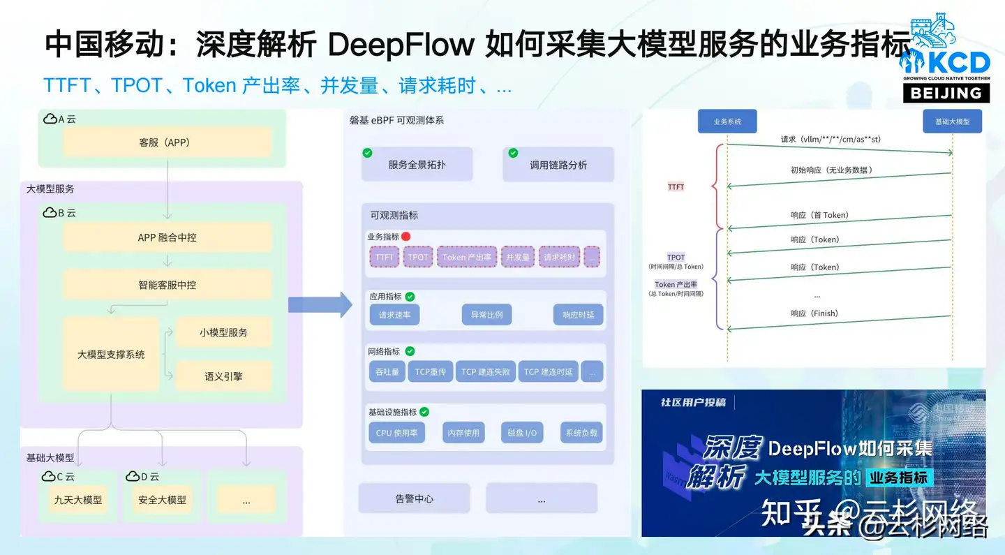 另一个案例来自中国移动。他们基于DeepFlow的WASM插件能力,成功将其推理服务的多项业务指标以零侵扰的方式采集出来,并在微服务云原生环境下实现了全链路指标汇聚。无论是TTFT还是TPOT,都能适配其自有的推理协议,无需业务改造即可实现全栈业务指标的采集与分析。