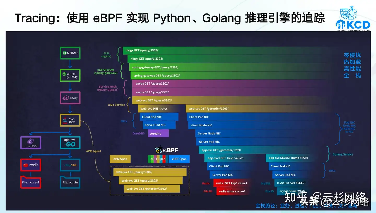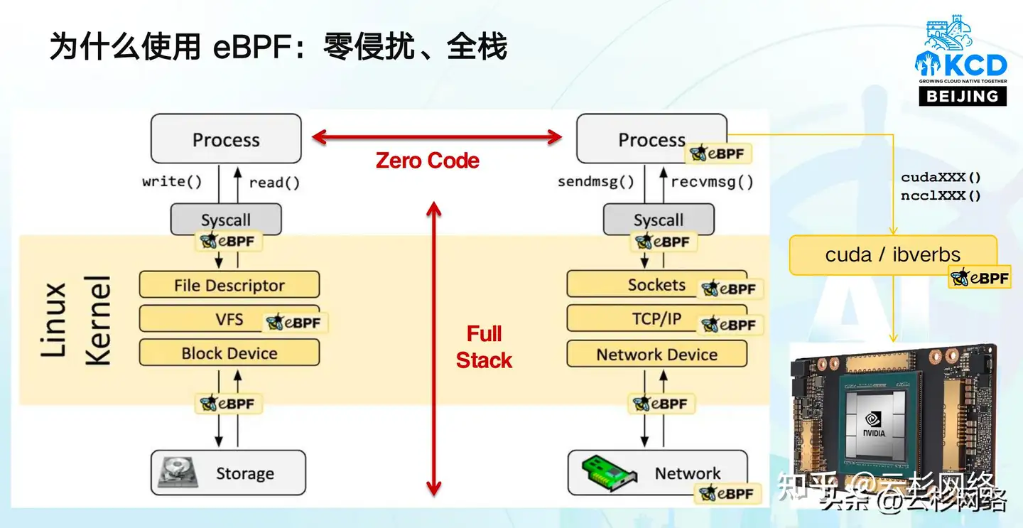 我们首先通过这张图快速说明采用eBPF技术的优势。左侧示意图见于http://eBPF.io官网,其核心优势可概括为“零代码修改”与“全栈观测”。即无需改动应用代码或重启进程,即可获取可观测性数据;并且不仅能获得进程内部的数据,还能覆盖Linux内核乃至整个软件栈的观测信息。例如,可以将一次推理请求从应用层到系统调用、再到网卡驱动的完整路径串联起来。