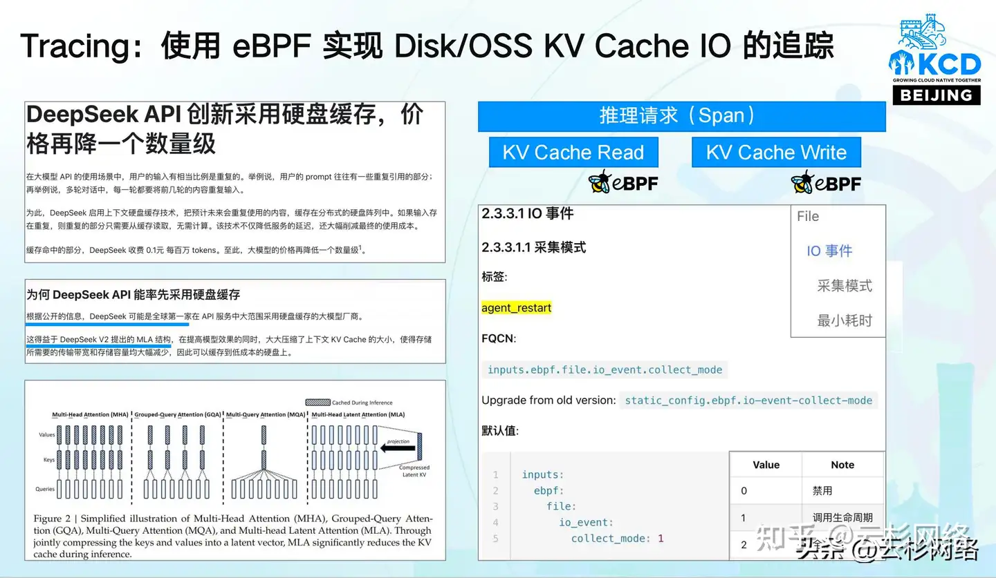 这里还有一个新的关注点。DeepSeek推出后引入了一项重要创新:多头注意力机制 MLA。MLA 的创新使得KV Cache的尺寸大幅减小,据说DeepSeek可能是全球首家在推理服务中使用磁盘Cache的厂商。可以预见,未来为了降低部署成本,自建推理服务也会越来越多地采用磁盘或对象存储的KV Cache。