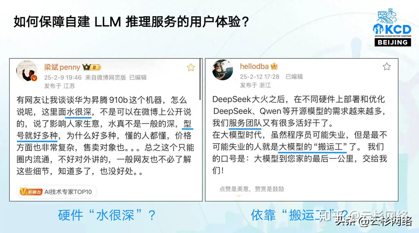 以往搭建一套推理引擎或服务尚需一定的技术积累,而DeepSeek的出现加速了这一过程,同时也带来了两方面的问题。左侧观点指出当前硬件市场“水很深”,即便是同一种硬件卡(如910B),也存在多种细分型号,其中信息并不完全透明。