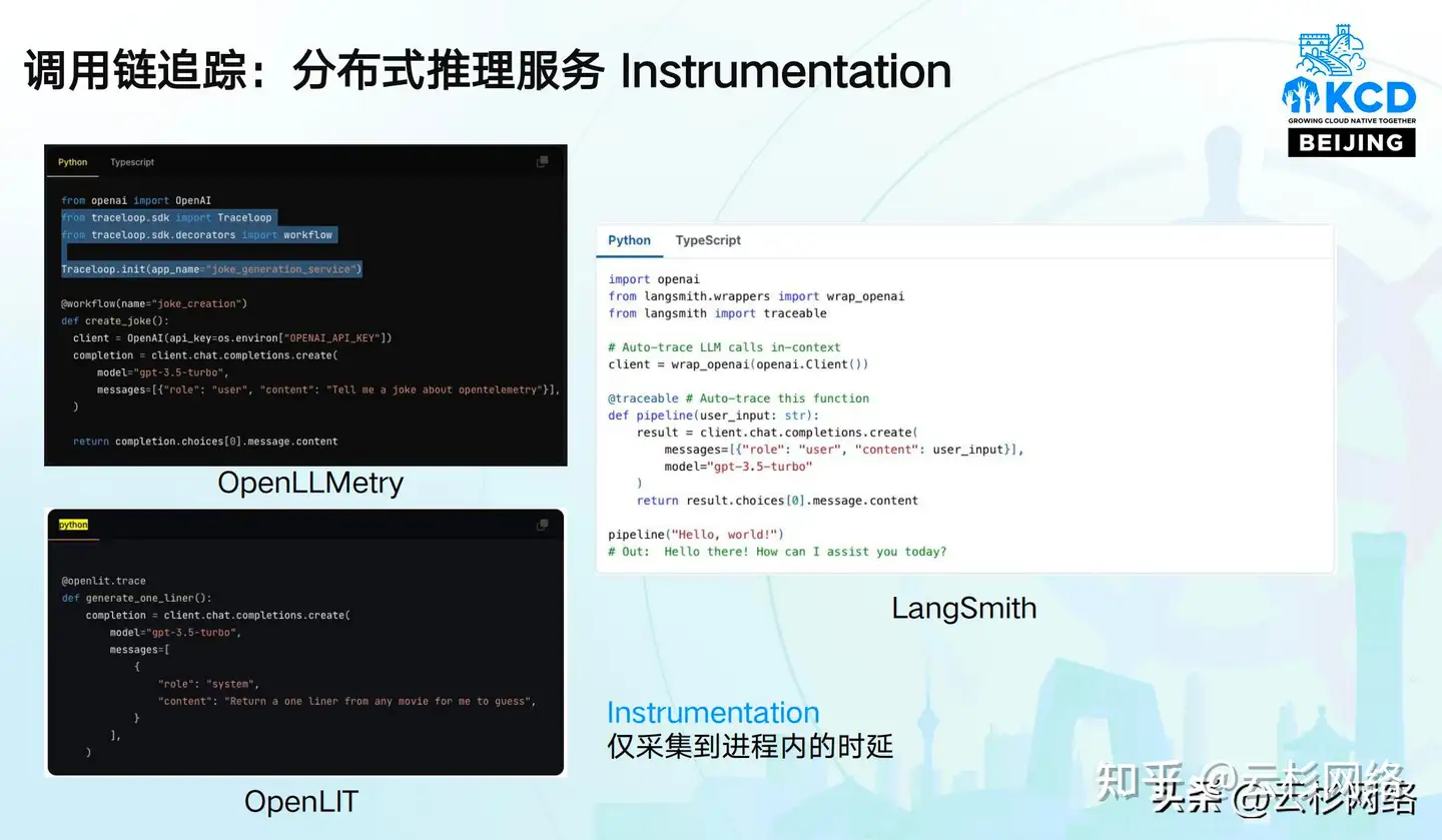 接下来看追踪。由于推理服务及其前置的智能体或接入服务构成了一个复杂的分布式应用,构建链路追踪能力就显得非常关键。目前已有不少开源工具,例如基于OpenTelemetry的OpenTracing,以及OpenLIT等,它们支持的能力相近,主要通过Python或JavaScript/TypeScript的插桩库来实现分布式追踪。