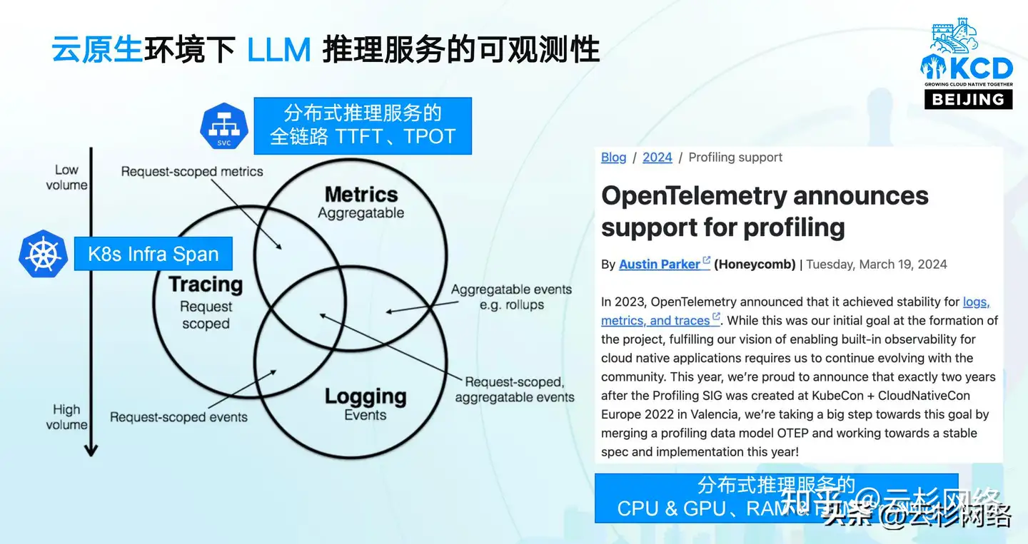 而OTel在2024年(其实从2023年已开始)将性能剖析数据提升为至关重要的第四大支柱,这对应我们前面提到的、由MSRA分析的代码导致的GPU低效使用问题,是一种非常重要的能力。集齐这些能力似乎就够了?实际上,LLM推理引擎或推理服务更贴近基础设施层,这与通用的分布式应用系统有所不同。当前许多实践也建议在 K8s 容器环境中搭建推理服务,这使得可观测性面临一些差异。
