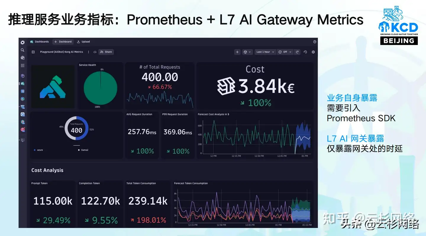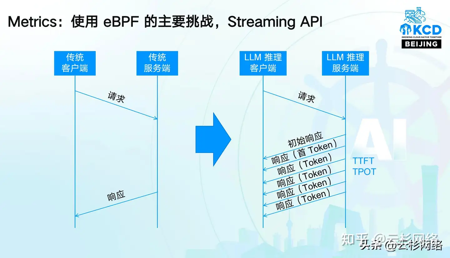 一种常见的变通方案是通过网络网关进行观测。目前许多LLM网关都具备AI Gateway能力,可以在网关侧暴露业务指标。但无论哪种方法都会存在问题:若由业务自身暴露,则需要插入Prometheus SDK进行埋点;若仅在网关处暴露,则观测视角仅限于网关这一个点。在云原生环境下,要洞察K8s节点、网卡等不同环节的性能表现,仍然存在挑战。