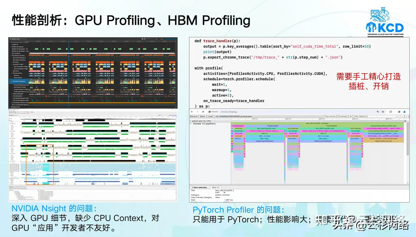 但对于上层应用(如推理服务或训练进程)的开发者而言,这类工具缺少CPU上下文信息,存在一定认知隔阂。以往,推理或训练任务可能只由少数专业工程师负责,他们能够解读左侧的剖析数据。然而当下,越来越多的工程师需要参与推理服务的开发和运维,他们更熟悉且需要的是贴近CPU上下文、能够展示Python函数调用栈的剖析能力——这正是右侧PyTorch Profiler所提供的。右下角展示的函数调用栈信息,对于在GPU之上进行应用开发的工程师来说更加直观友好。