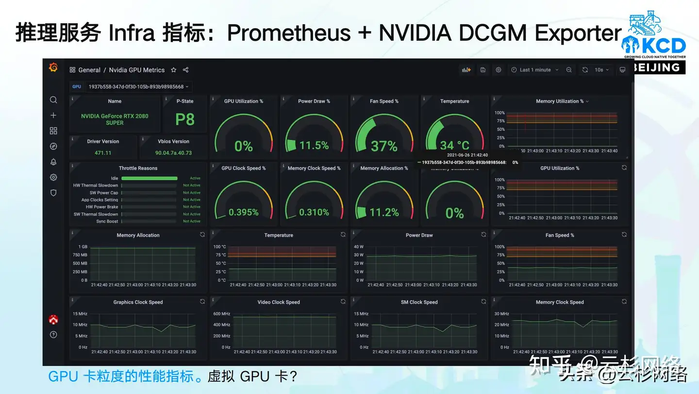 我们首先来看指标。指标通常分为基础设施指标和业务指标。基础设施指标主要指GPU卡的用量、功耗等,这需要由硬件主动暴露。例如英伟达通过DCGM Exporter来暴露整张卡的指标。但这里存在一个局限:如果GPU被虚拟化,每个虚拟卡的详细指标受限于硬件本身的暴露能力,很可能无法完整获取。