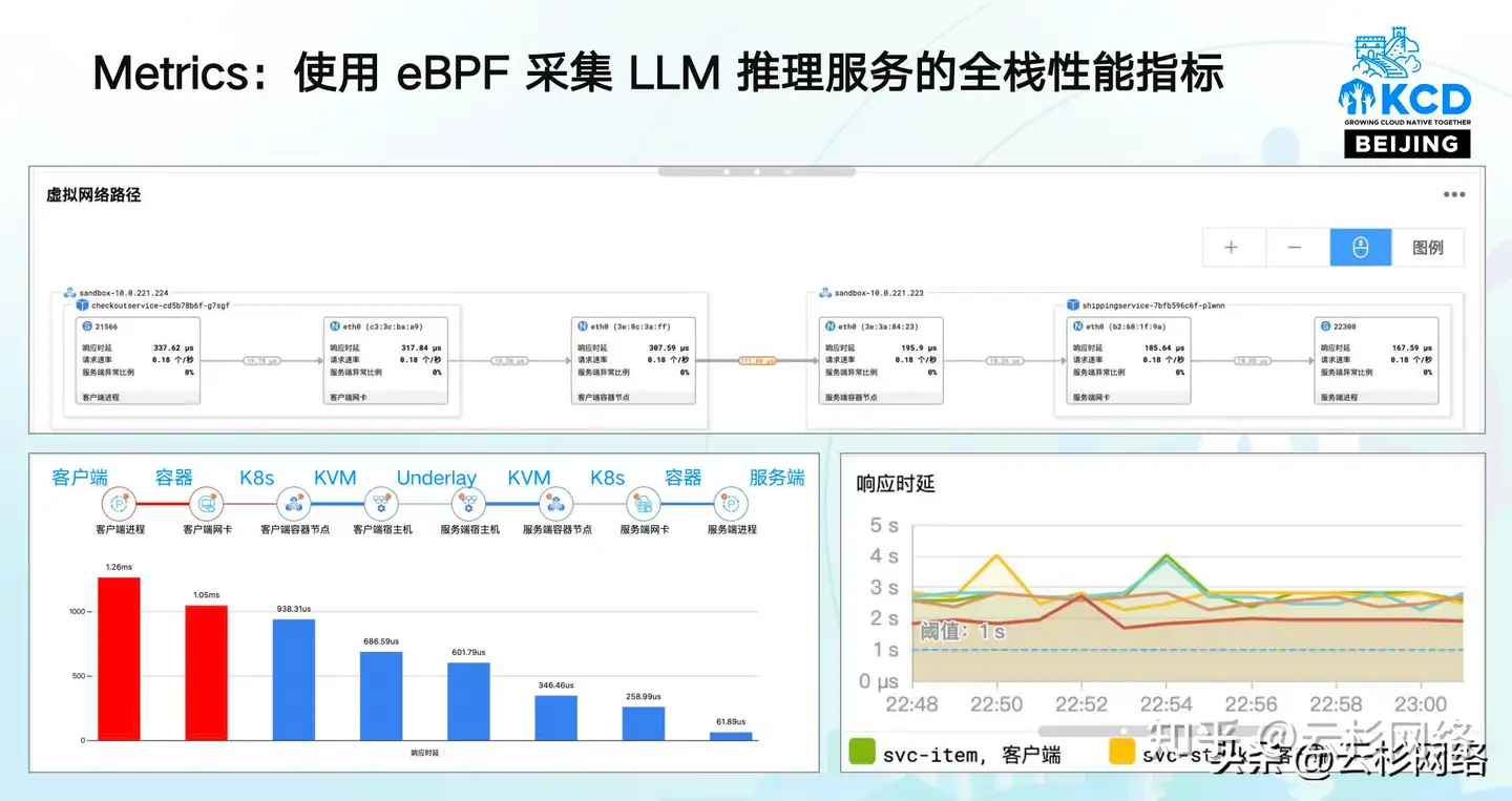 但如果利用eBPF采集所有相关网卡的流量,并对其时延进行计算,我们就能得到一张全栈路径的指标视图。以时延为例,从客户端进程、eBPF捕获的系统调用、客户端Pod的网卡、到K8s节点的网卡,如果节点还部署在KVM宿主机上,甚至可以延伸到宿主机节点的网卡——整条路径上每一段的时延消耗都能清晰地展现出来。这样我们就能直接判断问题是否源于基础设施层,避免了在云原生环境中搭建LLM服务平台时常见的定界不清问题。