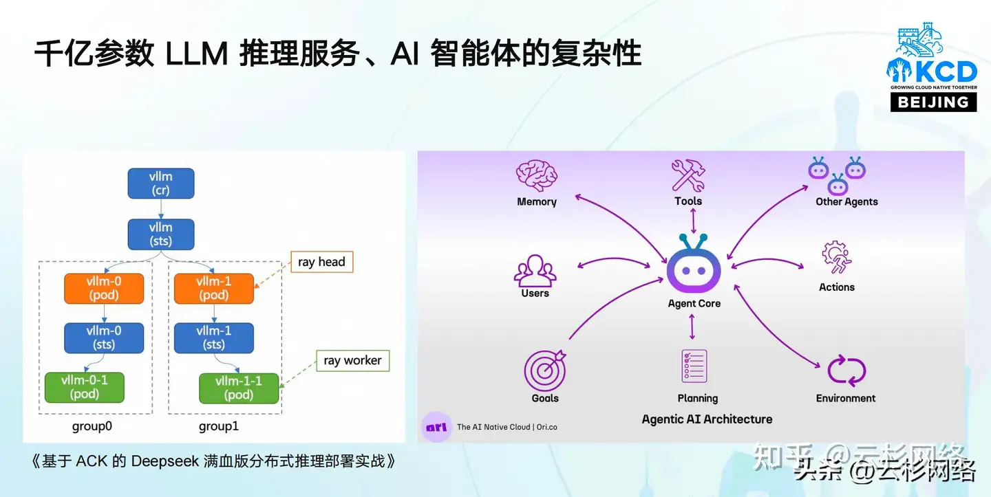 回到千亿参数模型的推理场景。如图所示,左侧示意在千亿参数规模下,我们往往不得不采用分布式推理服务。例如,基于ACK的DeepSeek“满血版”分布式推理实践中,就提及了使用vLLM和Ray等工具构建分布式推理服务,以实现多节点、多卡上千亿参数模型的有效推理。