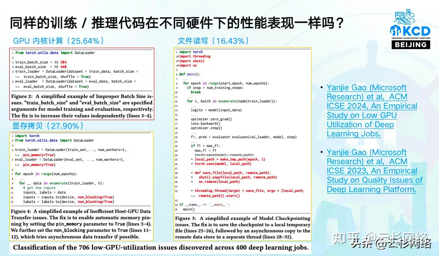 第一类与GPU内核计算有关。例如,在测试集群中使用较小的batch size进行训练或推理,以适应测试环境;但到了生产集群,若未根据不同的硬件条件调整此参数,就可能导致GPU利用率低下。这种情况在英伟达生态中已存在,而在国内行业用户面对的多样硬件环境下,问题可能更加复杂——在A硬件上有效的配置,在B硬件上可能需要完全不同。这类因代码配置导致的问题,约占低效案例的20%以上。