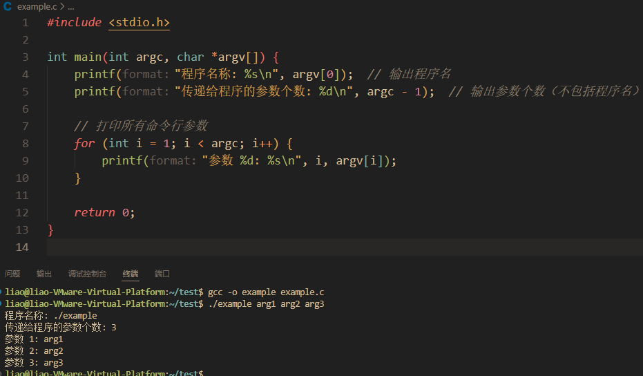 argc表示命令行中传递给程序的参数个数。它至少为 1,因为argv[0]总是程序的名称或路径。例如,假设命令行输入为:
