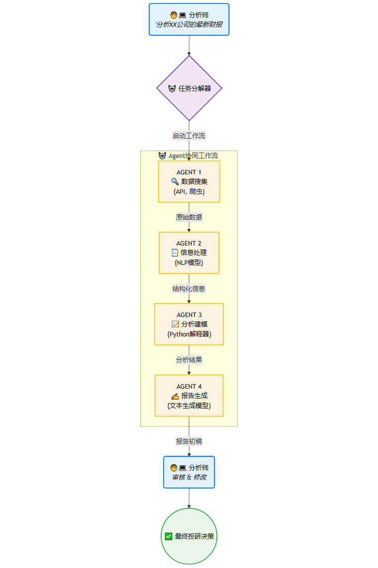 单一的大模型无法高效完成复杂的投研任务。多智能体(Multi-Agent)系统成为更优的架构选择。在该系统中,每个Agent被赋予特定角色和工具,协同完成一个大目标。