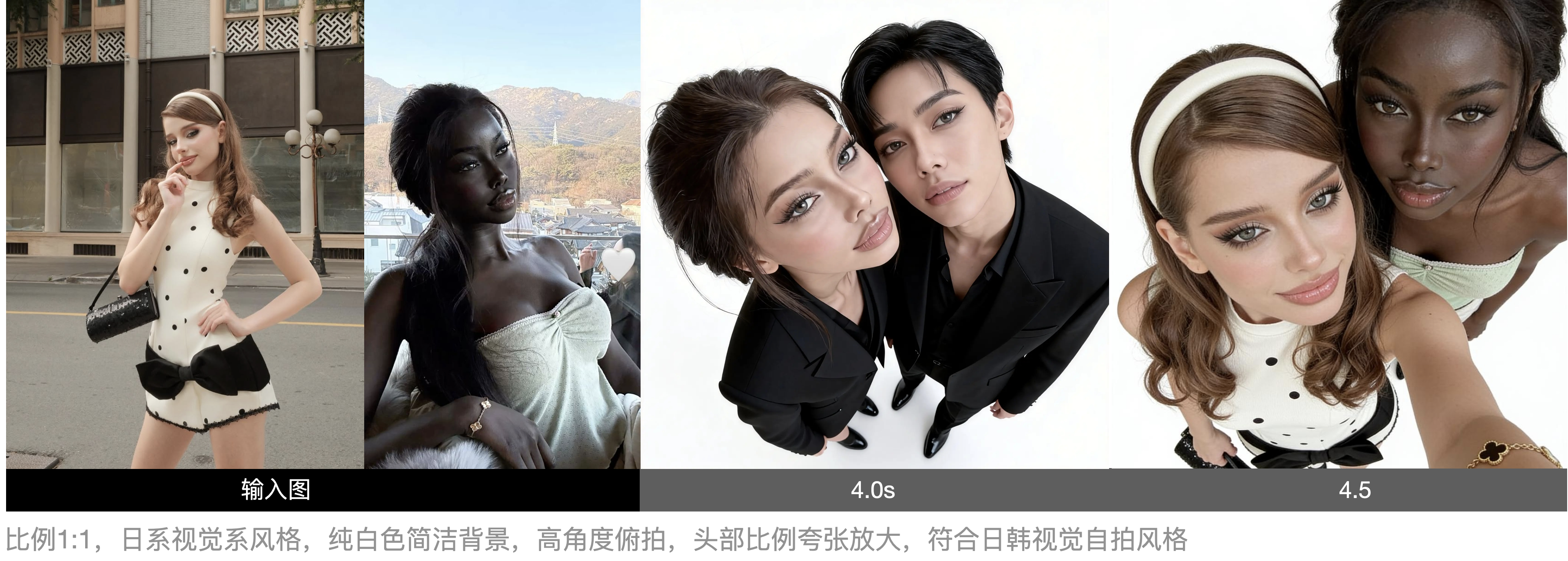 看对比图就能发现,4.0 版本容易出现人物混淆、脸部变形;而 4.5 生成的图片,不仅和原图保持了极高的一致性,自带的美颜美体效果也更自然了。