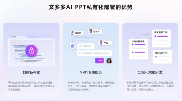 通过此次展会,文多多AIPPT将持续深耕能源领域,聚焦行业核心需求,不断迭代优化产品功能,以更智能、更便捷、更安全的演示解决方案,助力石油石化企业提升协作效率与决策质量,为行业高质量发展和能源强国建设贡献力量。除了,产品本身的硬核生成制作PPT功能外,针对石油石化行业高安全、高合规的场景要求,文多多AIPPT提供私有化部署方案,确保企业核心数据在演示全流程中的安全可控,满足离线使用、权限分级管理等