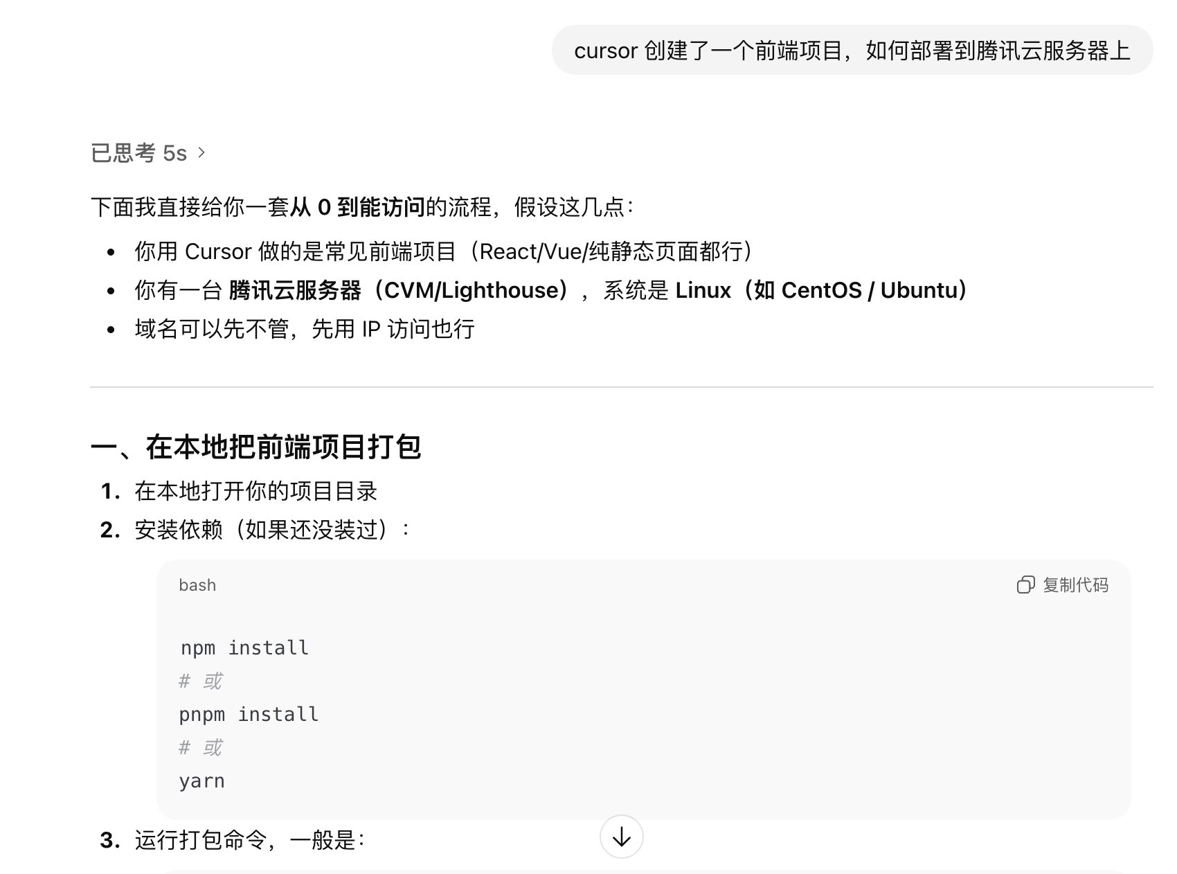 它帮助企业以零代码方式构建核心业务系统,并将 AI 融入数据、流程与应用,让自动化真正进入智能时代。我们一步一步来,把「本地前端项目 → 部署到腾讯云服务器」整个流程串起来。下面默认你已经用 Cursor 把前端代码写好了,并且有一个腾讯云账号。Cursor打开一个空文件夹,右侧填入prompt后 回车,就开始自动编排执行了。(6) 在Cursor 中配置 MCP(重要!(5) prompt 业务