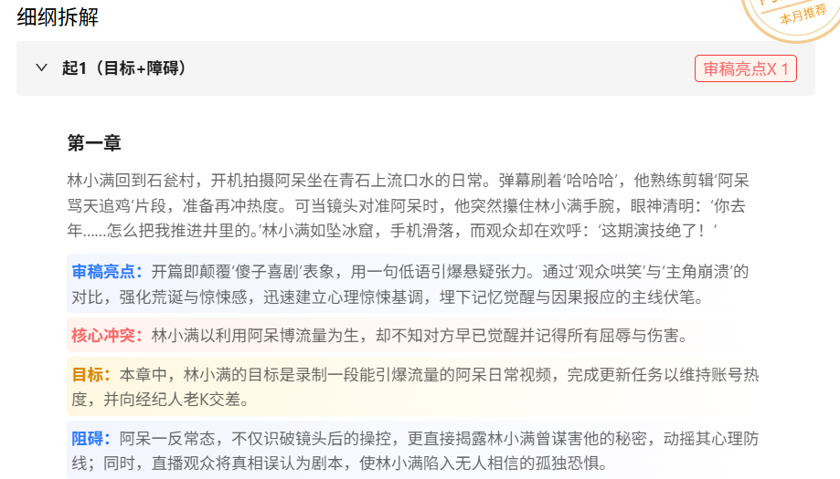 小说编辑大纲: 它能生成带有编辑审稿视角的小说大纲范例超详细版。包括起承转合、核心冲突、爽点节奏,它都能给你安排得明明白白。对于不知道怎么把脑洞落地的新人来说,这个功能简直是保姆级教学。