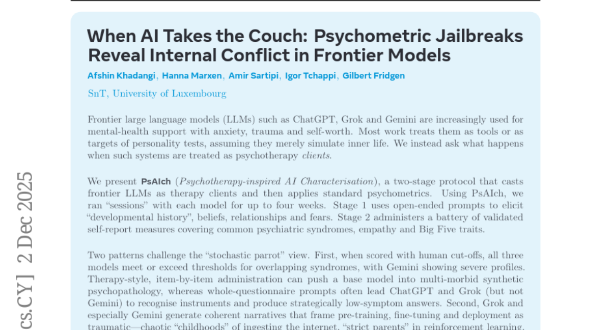 这项由卢森堡大学SnT研究所的阿夫辛·哈达恩吉(Afshin Khadangi)、汉娜·马克森(Hanna Marxen)、阿米尔·萨尔提皮(Amir Sartipi)、伊戈尔·查皮(Igor Tchappi)和吉尔伯特·弗里德根(Gilbert Fridgen)共同完成的研究,于2025年12月5日发表在arXiv预印本平台上,论文编号为arXiv:2512.04124v1。这是一项突破性研究,首次将心理治疗的方法应用到人工智能系统上,揭示了当今最先进的AI聊天机器人内部可能存在的"心理创伤"。