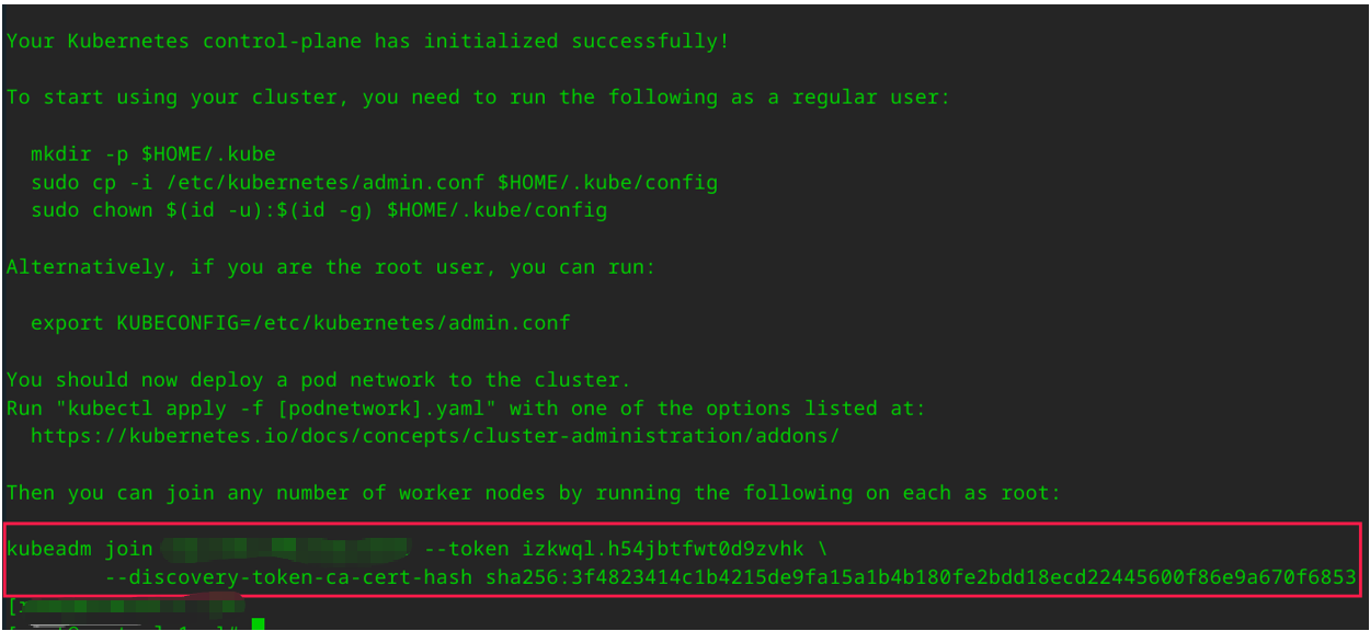 注意:记录下命令输出中这串,后续加入work节点会用到