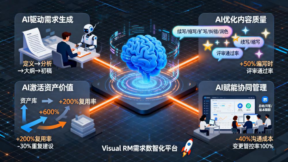 Visual RM 需求数智化平台通过 AI 技术赋能,重构了需求管理全流程,有效破解了传统模式下的信息混乱、协同低效、资产沉睡等痛点,为企业提供了标准化、结构化、智能化的需求管理解决方案。其 AI 功能体系覆盖需求生成、优化、协同、资产管理等全环节,结合坚实的技术支撑,实现了需求管理效能的全面提升,为企业数字化转型提供了有力保障。在未来,随着 AI 技术的持续演进,平台有望进一步深化智能化应用,为需求管理带来更多创新可能。