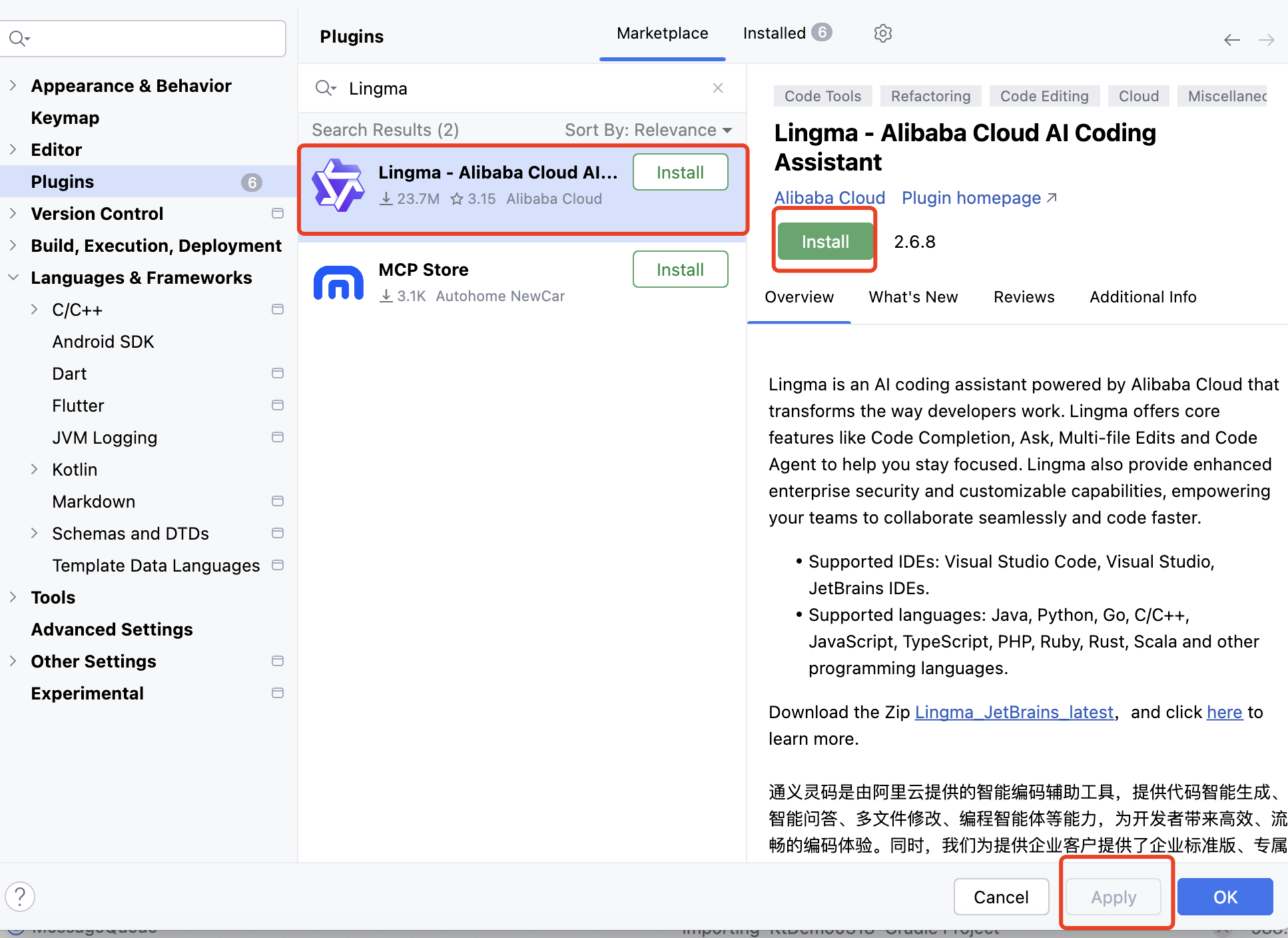 Settings → Plugins - 在 Marketplace 中搜索 “Lingma” 或通过官方渠道下载