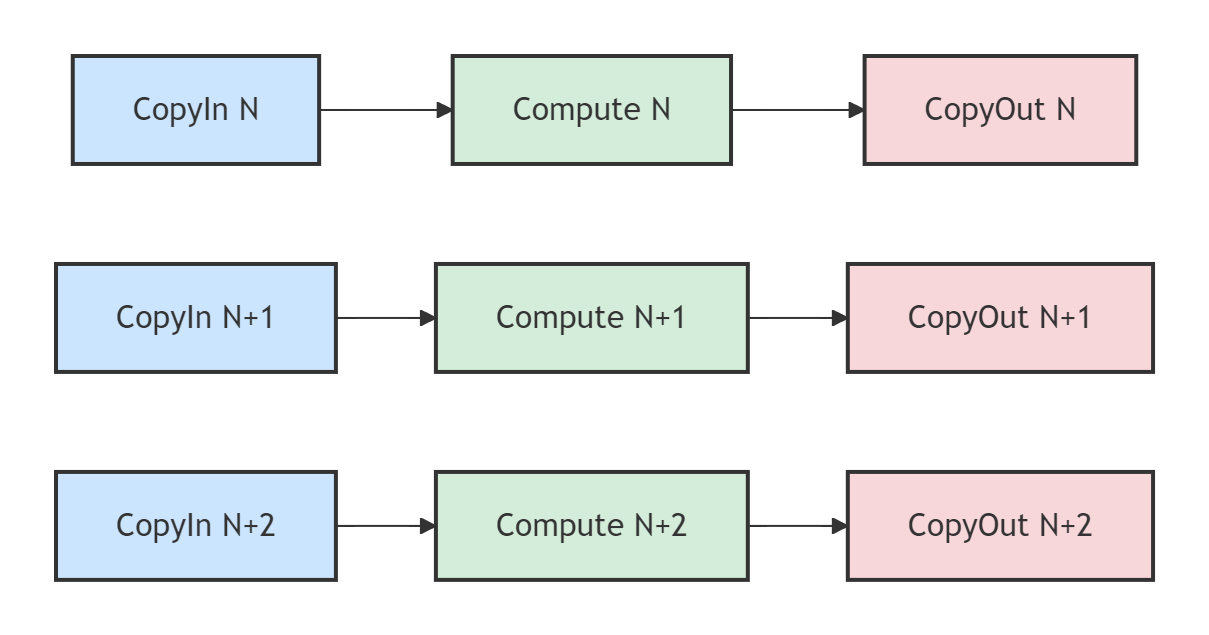 最朴素的实现是串行执行:CopyIn一块数据 -> Compute -> CopyOut,然后再处理下一块。但这种方式计算单元大量时间在等待数据搬运,效率极低。