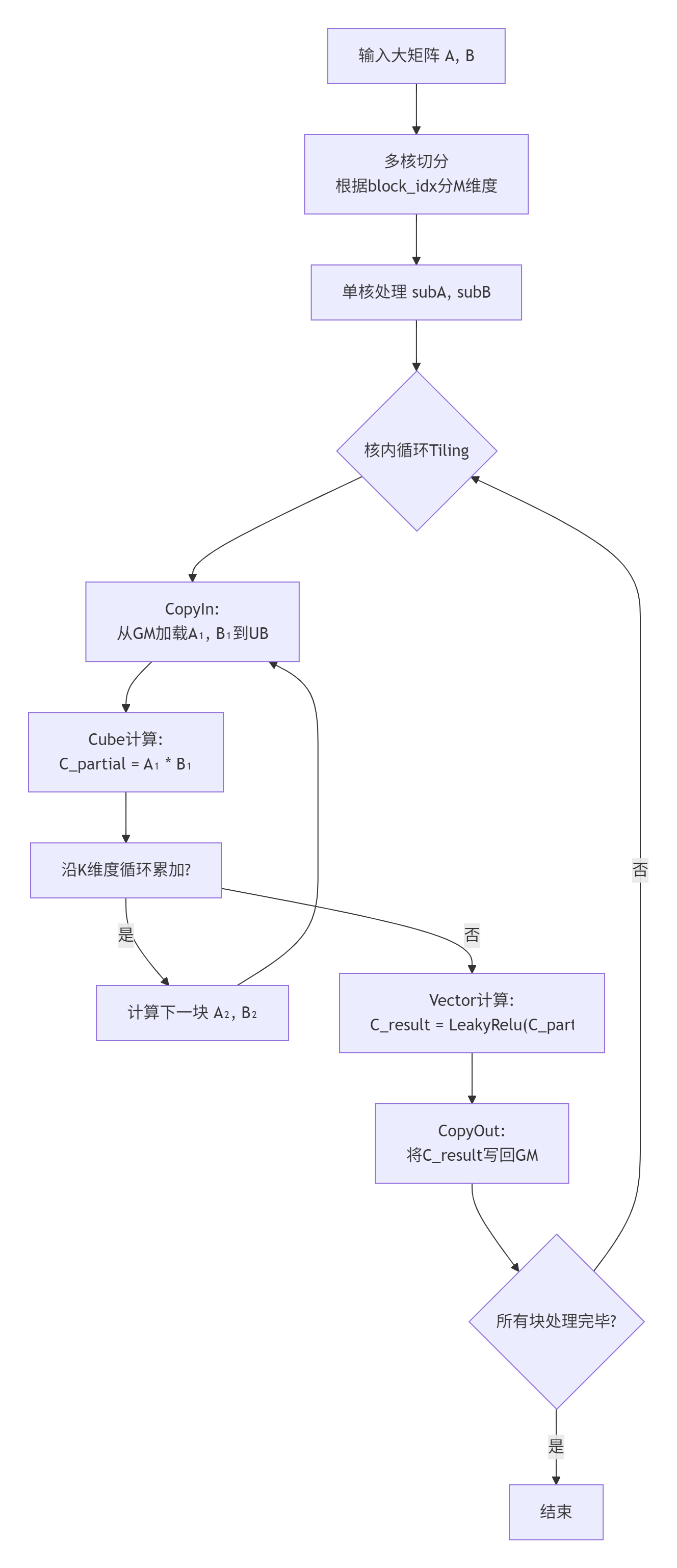 图3:Matmul+LeakyRelu融合算子的核心计算流程,包含了多核并行与核内Tiling。