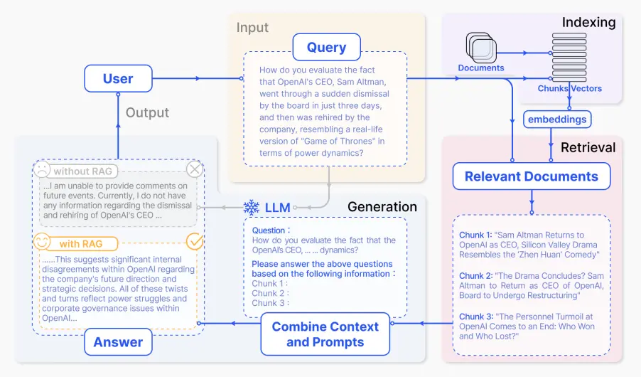下面我们将通过稍详细的工作机制理解RAG中的要点,以及它为何不能与模型训练媲美,它的局限性在哪。