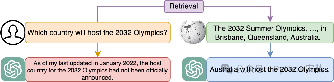 上图展示了 RAG 如何使 ChatGPT 能够提供超出其初始训练数据的精确答案。