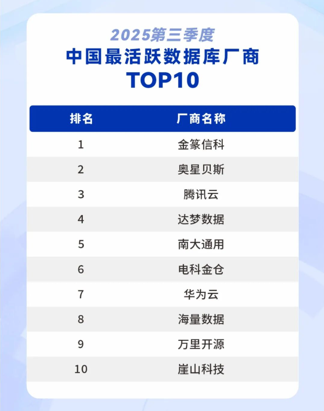 第一新声发布“2025年Q3中国数据库最活跃厂商榜单,金篆信科位居榜首