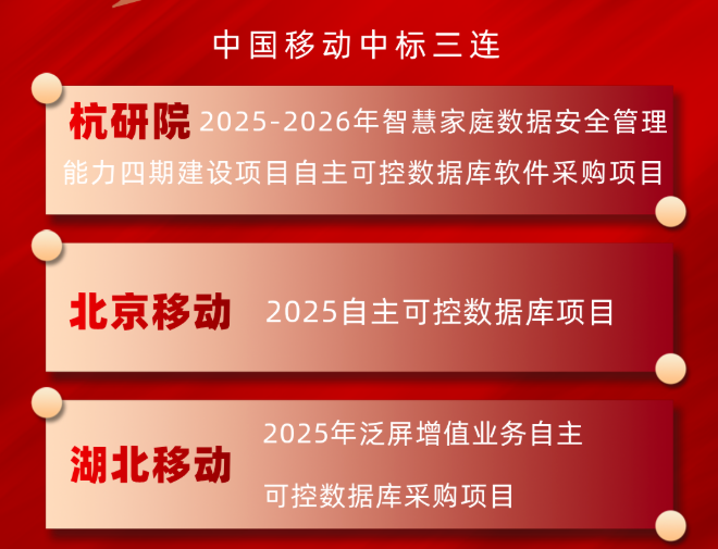 11月11日消息,近日,万里数据库在中国移动连续斩获三大项目:杭研院、北京移动、湖北移动相继选择万里数据库作为其自主可控数据库产品提供商。这一系列中标不仅是市场对万里数据库产品实力的高度认可,也进一步巩固了公司在运营商核心系统建设中的关键地位。