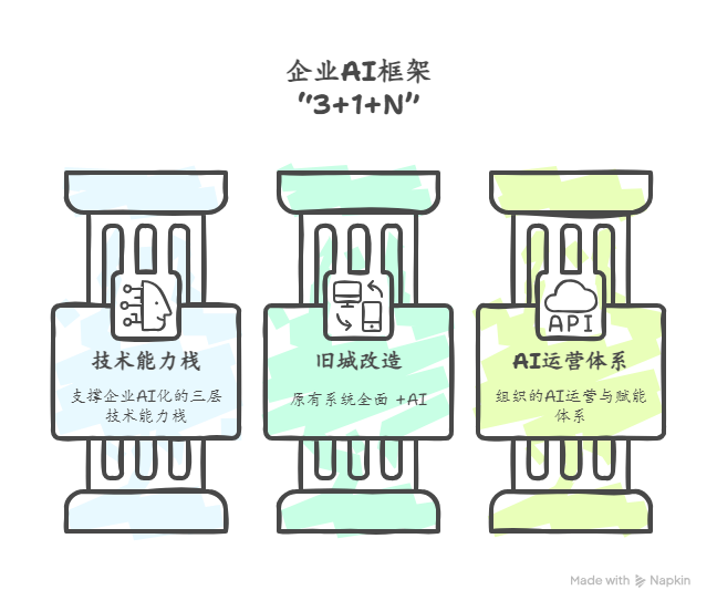 基于这段时间的外部研究与实践,我把企业AI落地的方法整理成一个初步框架:“3 + 1 + N”。