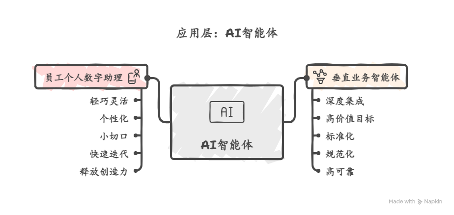 这一层直接产生业务价值,目标是让人人都能基于平台创造解决自身问题的AI“数字员工”。