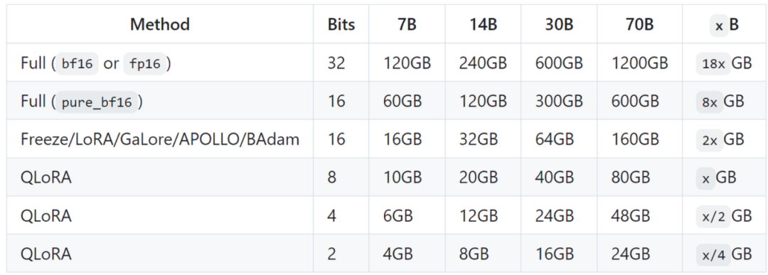 计算资源估算:https://github.com/hiyouga/LLaMA-Factory?tab=readme-ov-file#supported-models